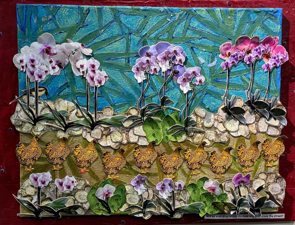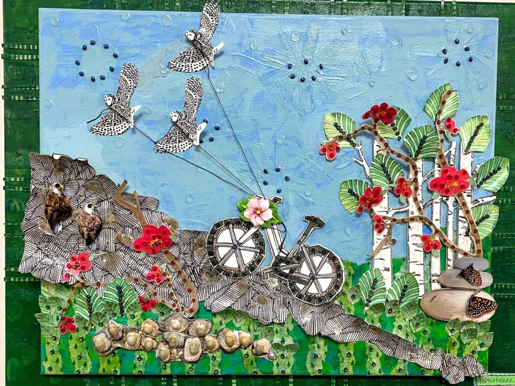 I have always made art – jewelry, necklaces, quilts, to name a few. In the last few years, I have become focused on mixed-media and collage, exploring a variety of techniques and combining different materials to communicate feelings about larger themes.